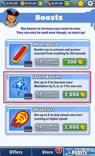 点击商店里的强化,购买“得分加成”后在游戏中使用,可在短时间内提升倍数。
