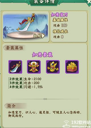 游戏内的紫色装备主要分为降妖套装和如意套装,分别对应游戏内的输出类角色和坦克类角色的装备,输出类角色推荐使用降妖套装,坦克类角色推荐使用如意套装,如意宝刀作为所有坦克类葫芦娃的缘分武器(小金刚除外),多使用并且强化可以更好地强化自身属性以及战力,降妖套装主要提升的则是输出,推荐给后排葫芦娃使用。