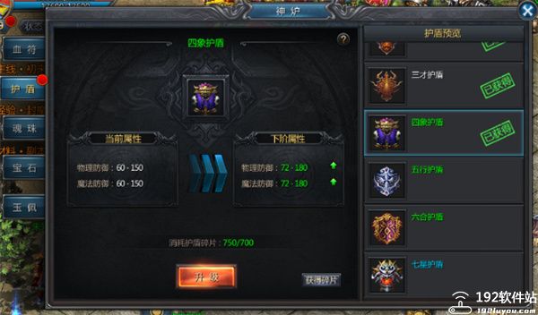 3、护盾不可以进行强化。 点击主界面的神炉系统图标,进入护盾界面:护盾分为10级,等级越高的护盾能够提供给角色更高的物理和魔法防御加成。 低等级的护盾可通过消耗护盾碎片进行升级,进阶为更高等级的护盾。拥有高等级护盾,再也不担心被别人一刀秒杀了。