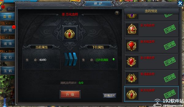 王者传奇高爆版,点击主界面的神炉系统,进入血符界面。血符分为15级,等级越高的血符能够提供给角色更高的生命值加成,让你在打头目当中不在为血少而烦恼。低等级血符可以通过消耗血符碎片进行升级,成为更高一级的血符,带来更多的生命值加成。拥有高等级血符之后,一向脆皮的法师也能站撸头目啦!
