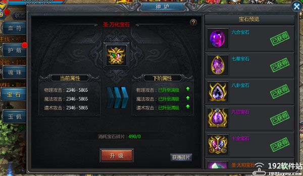 点击主界面的神炉系统图标,进入宝石界面:宝石分为15个等级,等级越高的宝石能够提供更多的属性加成,极大提升人物的攻击力。 低等级的宝石可以通过消耗宝石碎片,合成为高一级的宝石,不用担心低等级的宝石没地方用啦!