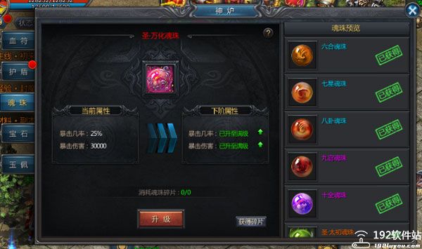 3、魂珠不可以进行强化。点击主界面的神炉系统图标,进入魂珠界面:魂珠分为15个等级,越高等级的魂珠能够提供给佩戴者更高的暴击率与暴击力提升。 低等级的魂珠可以消耗一定数目的魂珠碎片进行升级,提升为高一级的魂珠。