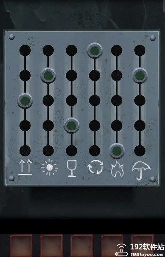 23、根据院子里摆放的纸箱子上的图案的位置调整机关上对应图案的滑块的位置(火苗:1、酒杯:2、箭头:3、雨伞:4、太阳:4、循环符号:5)