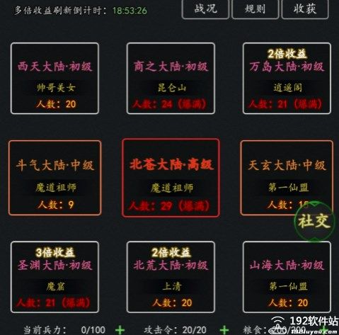大量的硬通货-仙缘奖励产出。这里是大小帮派秀实力的副本,实力越强的帮派可以占据的资源更好,奖励也就更丰富。通过占据、挑战、击退外人,达到占领大陆的成就,便可以享受大陆的资源产出。