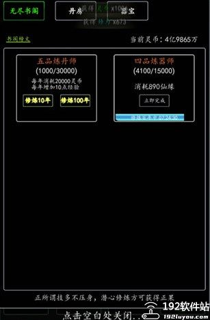无尽书阁可以提升炼丹和炼器等级。丹房可以修仙丹药,品阶越高,炼丹成功率越高。器宝可以炼器,产出更高级别的武器跟法宝,炼器品阶越高,炼器产出成功率越高。