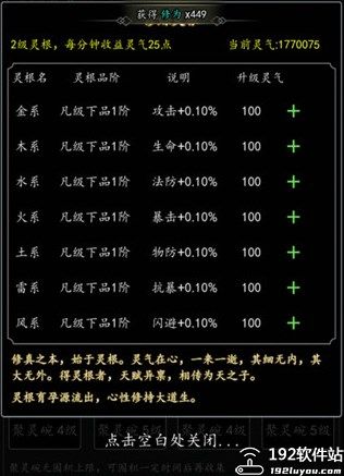 灵根每间隔一段时间可以收获灵气,灵根等级越高收益越大,进入灵根后,可以消耗灵气提升主角的百分比属性加成