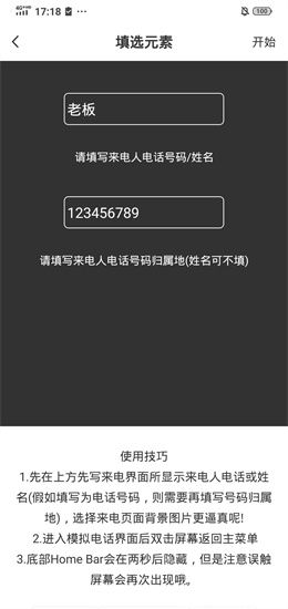 3、设置来电人的姓名和归属地,或者号码,点击开始使用即可,再也不用到处找人发短信求助了!随时开溜;