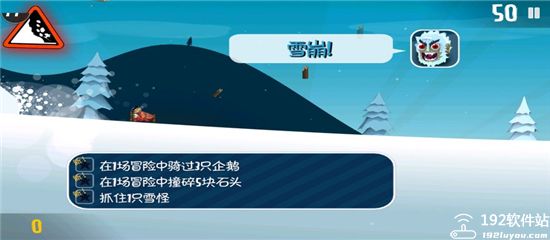 4、开始挑战,雪崩来了,你需要完成三个任务,在冒险中骑过3只企鹅,撞碎5块石头,抓住一只雪怪。