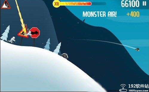 这里的加速指的是中上方的速度条,最大可以x8,也就是八倍速。当然这不是指你的游戏速度快了八倍,而是说你滑雪时速增加了,每秒走过的路程数大大增加。加速的方法有很多,除了动物可以为你增加速度以外,假如你做了一个完整的后空翻,就会为你加一级速度,这一般是在陡坡处滞空时间较长的时候进行的,在着陆的一瞬间会喷出黄色火花为你加速。