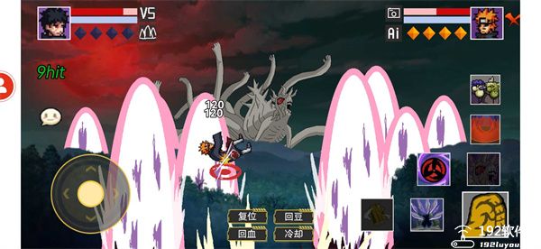 1、经典复古的像素风图形打造的各种帅气忍者,可以操控这些忍者来同其它动漫之中的角色进行格斗。