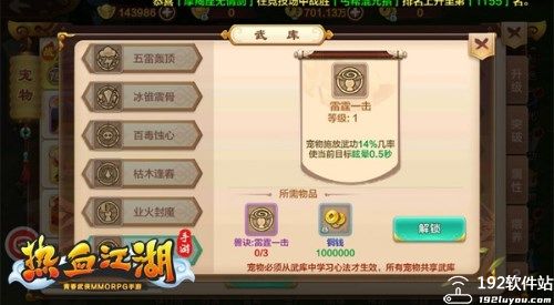 2、武库则是玩家解锁宠物心法的地方。当玩家获得了足够数量的心法时,即可花费心法和一定数量的铜钱来进行解锁。解锁后的心法可以进行升级以加强效果。宠物心法有很多,不过每只宠物最多只能装备5本心法。所有宠物共享武库内的心法。