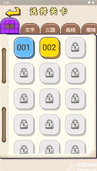 1、进入游戏后,一共有五种关卡可以选择,找茬、文字、三国、画线、摆摊。