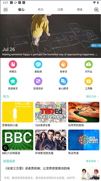 1、省心模块有非常多可学习的内容,从背单词到口语和文章阅读等;