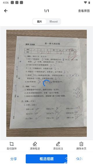 3、点击框选错题,然后转word文档,则可以打印出来。当然如果你需要添加批注或者清除笔迹都可以。