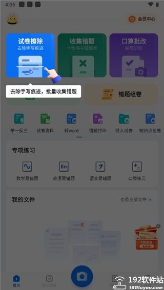 1、点击首页上方的“试卷擦除”,可以去除手写痕迹,批量手机错题。