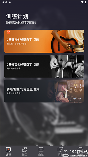 吉他自学app。虽然无法保证你一定能学会,但试试总归是可以的,尽管里面有很多课程都需要付费,但也有很多课程可以试听。想要开始使用软件,需要你先完成登录。通过手机号验证完成之后,便可设置账号的密码,完成后即可默认登录。软件首页部分排列的就是训练计划模块,不仅包含零基础弹唱自学模块,还支持尤克里里教学模块。来到社区版块,这里会有很多用户分享的自己学习吉他的成果录制成了视频。用户数量还是挺多的。再就是商城版块,这里可通过积分兑换各类吉他课,不过每一项的积分都挺高的。如果有在社区模块加好友的话,可在消息模块互相进行互动,这样一来,在吉他自学app互相之间交流吉他弹奏心得,也是一个不错的选择。
