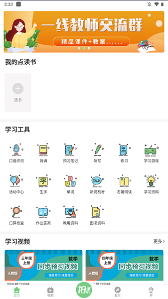 爱点读英语app正版大多数小伙伴通过它学习英语,但其实,它能做的不只有英语学习,还能帮助同学们学习各个科目,除英语外,还包括语文、数学等,年级上从一年级到七年级,这里都能找到,小学到初中的过度阶段的学习资料也包含。类型上,从口语到听写,再到生字,甚至还有名著阅读,内容之全面,让小学生们可以有更多自主学习的挑选。当遇到不懂的作业题,还可直接进入作业答案中查看。想要更便捷地预习课本知识,还可以进入视频学习界面,其中的课本知识会比较丰富。