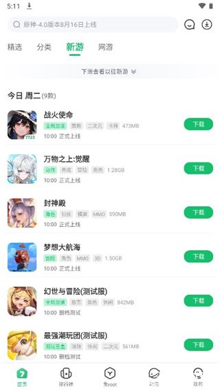 2、新游板块,每天都有更新,热门新游一网打尽,很多测试服、体验服也可以找到哦。