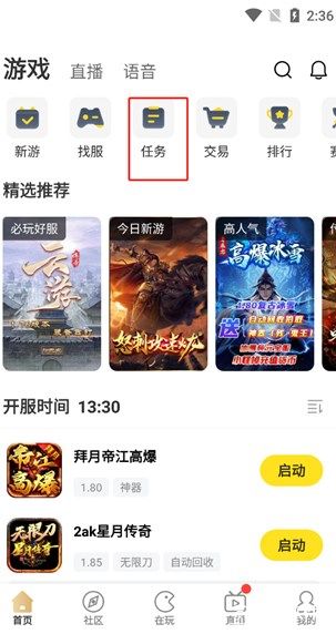 1、进入游戏首页,我们可以看到由新游,找服、任务、交易、排行等等内容,我们点击任务;