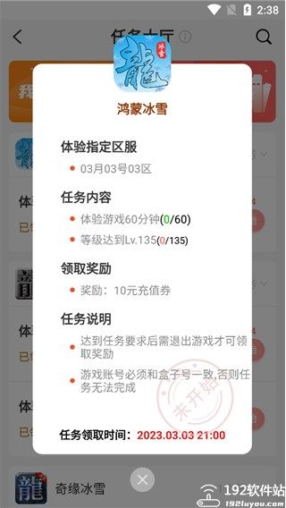 3、需要注意的是,每个任务都有自定的区服,达到任务要求后,退出游戏就能领取奖励,而且,游戏账号也必须是和盒子号一致,否则无法完成。