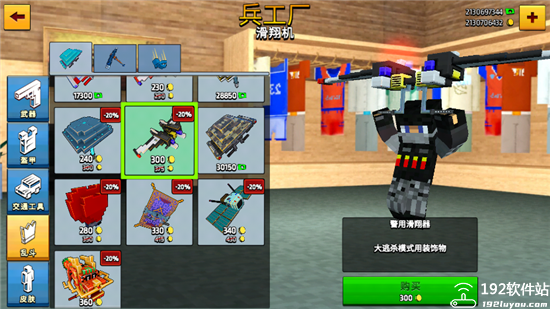 商店内还可购买乱斗兵工厂内的滑翔机,滑翔烟雾,应有尽有。单人任务模式精彩剧情任务,挑战各种艰难任务发挥你的勇猛强,获取金币换取更强大的装备。游戏内可联机进入其他玩家创建的房间,可邀请好友进入自己的房间一起消灭敌人,用强大的装备武装自己。