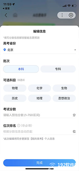 2、编辑自己的高考信息,包括所在省份、本科或专科,输入分数和排名;