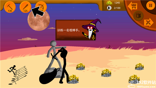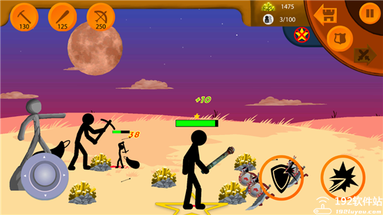 4、点击左上角不同的兵种来派出作战,矿工可增加金币的收入,注意右上角的金币使用量。