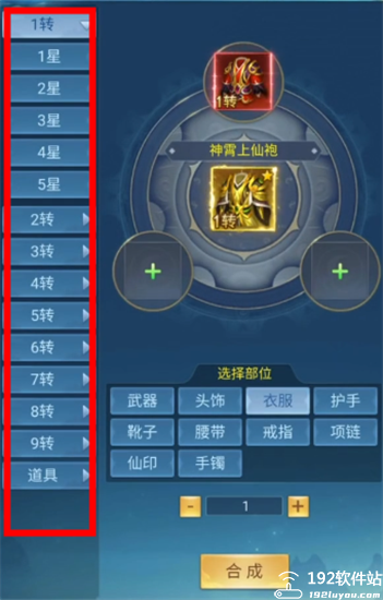 3、装备不齐全的玩家可以进入合成系统消耗对应的材料合成1转到9转的装备