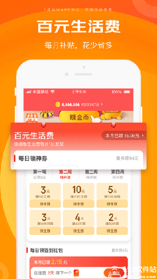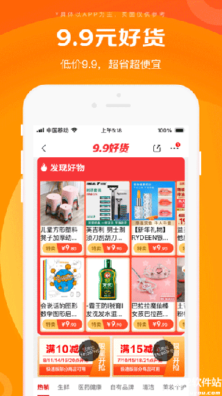 1、首页包含九块九好物模块,五元三件模块,都是大优惠;