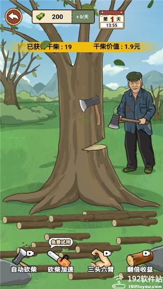 3、下方有些道具可以使用,自动砍柴、砍柴加速、三头六臂以及翻倍收益。