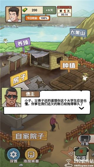我的乡村生活最新版本是一款非常现实的乡村创业类游戏,作为主角的你名叫陈昊,今年19岁,是村里唯一一名通过高考考上大学的大学生,本来有着非常美好的未来,但是你的父亲却沉迷于赌博,终日无法自拔,越输越多,最终变卖了所有家产用来还债,最可怜还是在一次车祸中你的父亲不幸去世,家里只剩下你和年迈的奶奶相依为命,没办法,因为支付不起学费,你只能放弃学业,回到农村寻求发展之路。在我的乡村生活最新版本,由于父亲欠下的赌债没有还完,催债人来到家里要你五天内拿出2500块,要不然要你好看。没办法你只能上山砍柴,种地,养鸡等方式赚钱养家,去村长儿子家吃席,还被嘲笑,就是如此惨淡的人生,看你如何逆风翻盘吧!
