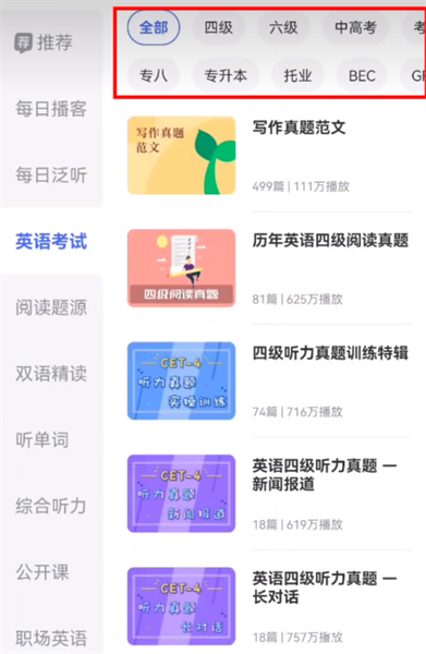 2、这里有四六级、中高考、专八多种重要的考试听力可以学习