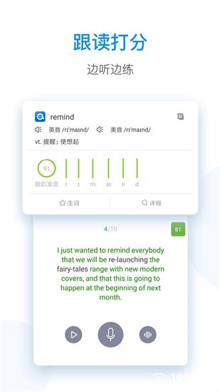 学习软件,根据当前的英语能力制定详细的学习计划,每天都有条不乱的进行学习,从听、读、写、背、默多个方式牢记每天所学知识点,而且包含多种类型可切换频道,软件还会根据用户每天获得评分,练习都分享到社区,与众多一起学习的朋友分享每天的进步。与此同时每日英语听力软件主要通过少儿英语、影视英语、有声读物方式来进行朗读,并根据每天朗读发音标准来进行修正发音,让用户学有所成可以拥有一口流利的英语发音,如果现在就想学习英语的话就快来使用吧。