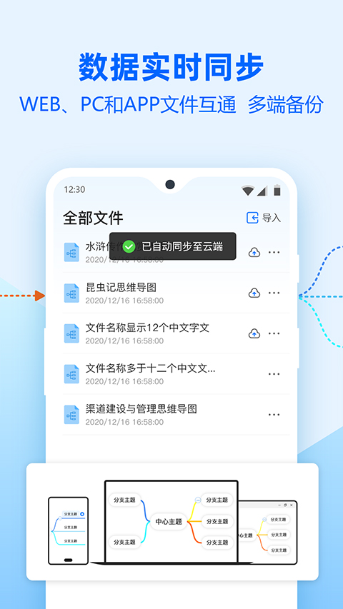 因此,迅捷思维导图app的用途非常广泛。支持用户自由编辑文字,同时还具备主题和节点样式一键切换的功能。此外,用户还可以方便地导入和导出多种文件格式,包括Word、PPT、Excel、Markdown、OPML、Xmind、XMM和Json等多种格式。而且,如果您在不同设备上使用同一账号,您的数据可以实时同步。无论是PC版、手机版还是在线浏览器编辑,都可以保持数据同步,使得您可以更加便捷地管理和使用您的思维导图。
