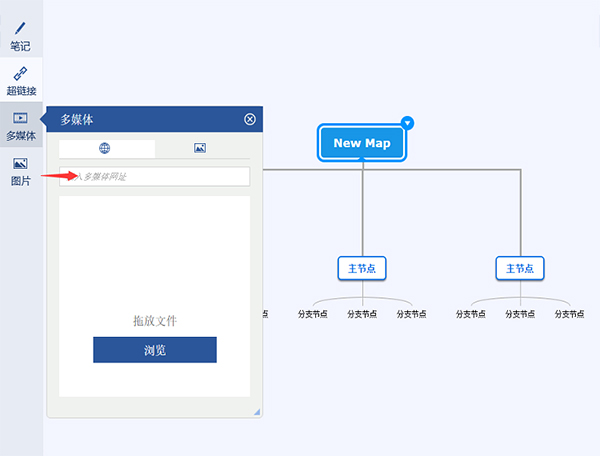 5、在画布的左侧工具栏中,您可以为导图的特定节点添加多媒体元素。只需填写所需多媒体链接至指定区域即可。