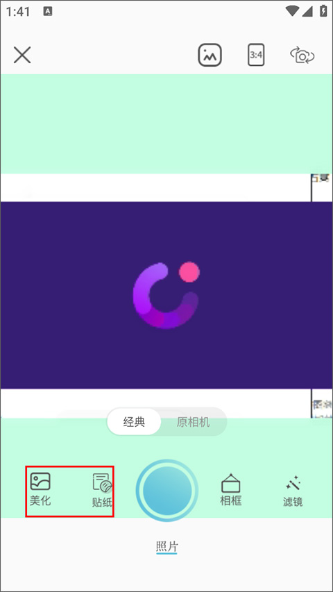 2、在美颜相机中,选择经典或原相机模式进行拍照,配合美化、贴纸等功能使用。