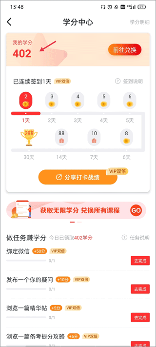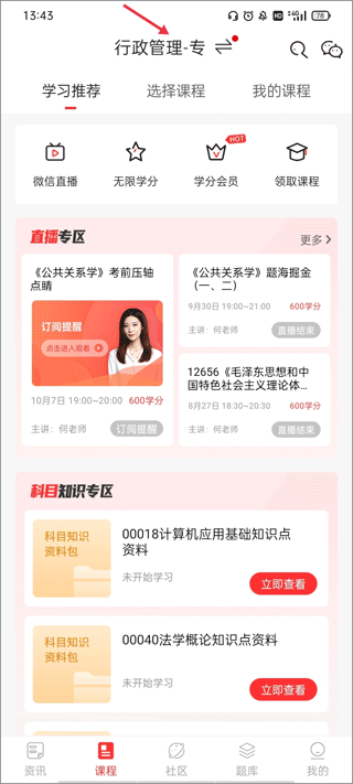 1. 在【我的】中的学习中心,查看学分并兑换课程或考试资料。