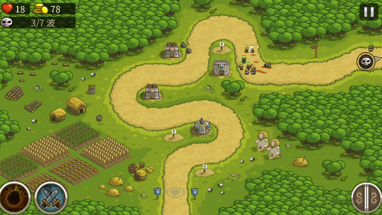 3、在第三波时,玩家会获得呼叫援军的技能,该技能CD为10秒,持续时间也为10秒,能够召唤两名士兵。技能冷却完成即可使用,与兵营士兵一同作战。
