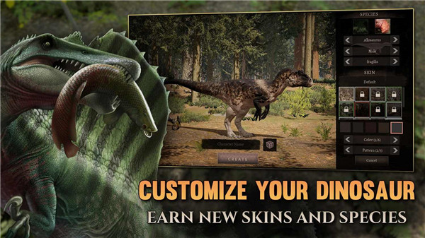在游戏中,玩家将扮演各种恐龙角色,在辽阔的大地上展开冒险。游戏中不仅有复杂的AI生物和多达200个玩家的生态系统,还可以解锁更多恐龙种类和皮肤颜色。玩家能体验到逼真的侏罗纪模拟,根据个人喜好定制恐龙外观和特征,与同类群体合作或独立生存。游戏还会不断刷新动态事件,鼓励玩家合作完成任务以获取稀有奖励。生存冒险玩法、高清画面和丰富的恐龙种类将真实再现侏罗纪时代的景象,让玩家沉浸在一个真实的恐龙世界中。1、打开游戏