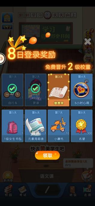 点击游戏界面的“8日登录”图标查看。连续登录获得奖励,包括精英学生和小摩托道具,增加校园的繁荣度。