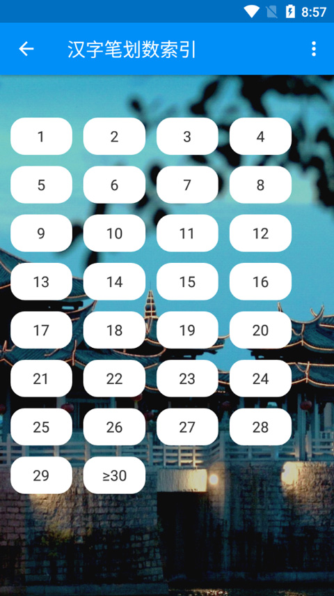 接下来,您可以点击屏幕左上角,发现更多功能,例如:高级搜索、潮州话音节索引、标准汉语拼音索引、汉字偏旁部首索引以及汉字笔画数索引等。