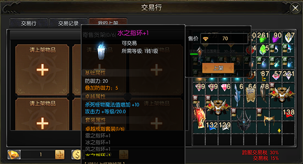 玩家交易存在交易税,本服交易交易成功会扣除卖方15%的交易税,买方不需承担,而跨服交易的交易税为30%。玩家在上架装备材料后,交易区会在该装备右上角显示一个头像,带有改头像的装备即为玩家自己的上架装备,非常方便查看。