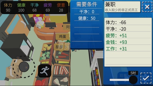 2、在游戏早期,通过便利店兼职挣钱是我们最快的赚钱方式。饿了就买些薯片或士力架恢复体力,脏了就到路边水龙头简单清洗一下。
