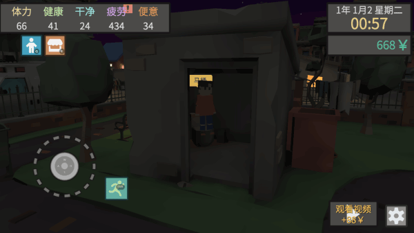 在出生地玩家可以洗澡、上厕所,而玩泥巴乞讨的bug尚未修复。离开该地点时,记得回去的路线,以免迷路。之后可以前往最近的超市兼职,然后到公园的三个长椅休息。附近的垃圾桶里大概率能找到薯片,可以帮助恢复体力。当攒够100元后,方便释放一下,然后回去洗澡,重复这一流程。如果体力不足,可以将超市工作时间调满,休息一会儿后继续工作。记住,工作量只调整到300元为店员,然后工作量调整到1500元后去餐厅。这样反反复复可以快速赚钱。