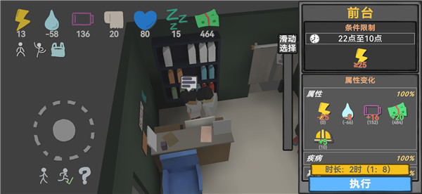 另外新手玩家可以前往工地做小时工,不过需要注意自身的疲劳和健康数值,当数值较低通过吃饭和喝饮料来恢复体力降低这些数值。并且还有店员、店长、前台、教师多个不同职业可以尝试,职位越高工资也越丰富,如果游戏想体验与众不同的沙盒生存,那么这款游戏就非常符合你的需求。