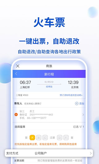 3、火车票预订:包括高铁、动车及普通列车;国内外火车票预订服务,12306直连;云抢票服务,快速安全;支持火车票退改签和在线选座。