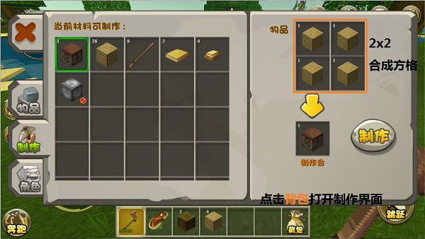 一、背包界面的【制作】标签页,2x2的合成格可以制作简单的道具。制作台就是在这里合成的!