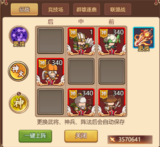 进攻方面:神周瑜攻击会叠加“天火”效果,且队友的攻击,追击或反击神店周瑜都会追加攻击,满层后将会为敌方带来毁灭性打击,神华佗攻击会回复友方生命值简直是生生不息,神诸葛亮施放"八阵神图”还能为全体友方平摊所受到的伤害,由此组成了进可攻退可守的黄金铁三角!