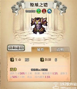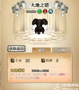 大地之铠:满级提供被攻击15%的防御加成和80%生命以上魔法减伤10%。