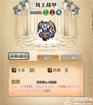 风王战甲:满级提供5%的防御和生命加成和30%几率减伤远程伤害30%。
